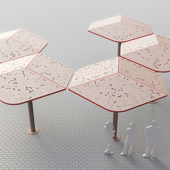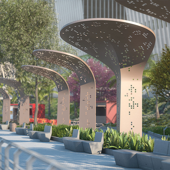 Proyecto de equipamiento urbano y mobiliario de exterior El Plan de expansión de la ciudad de Barranquilla promovió, a partir de 2010, la urbanización de nuevas áreas con múltiples funciones: recinto ferial, centro de conferencias, malecón sobre el río Magdalena, zonas gastronómicas y comerciales — en total, más de 80.000 m² de espacio público. El encargo fue diseñar una familia de objetos coordinados con la identidad del predio Puerta de Oro, integrando funcionalidad, durabilidad y coherencia visual. El marco conceptual partía del lenguaje arquitectónico existente y los materiales predominantes — cemento, chapa de hierro y su patrón calado —, elementos que definieron la expresión material del conjunto. |