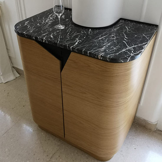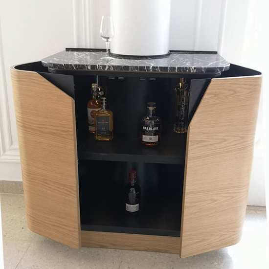 | Diseño y desarrollo de pieza única, específica para ese espacio de transición entre living y comedor para un cliente experto de "single malts". Esto alentó a diseñar un mueble que contuviera vasos y copas, iluminación, e invitara a la degustación. Su volumen y el uso del roble reconducen a las barricas de añejado. |