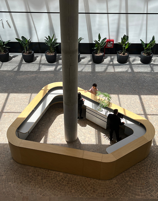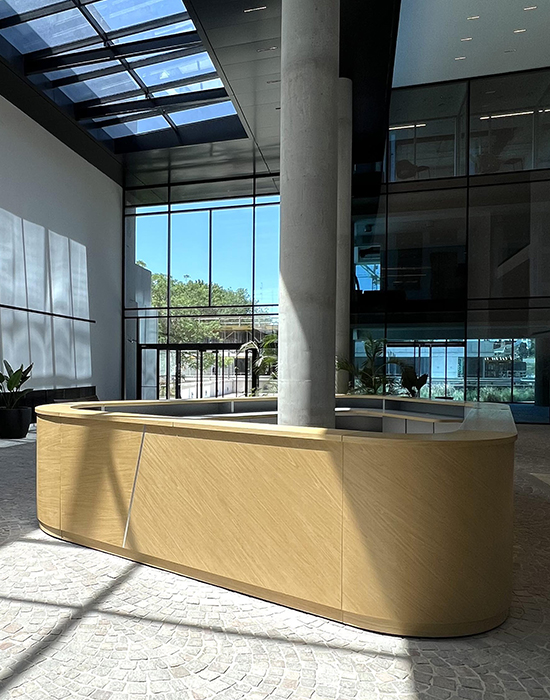 Diseño de mobiliario de recepción El encargo consistió en desarrollar un mueble de recepción específico para el edificio WO Leaf, dentro de un hall de triple altura que articula los accesos y circulaciones del complejo. Cada nivel del edificio balconea sobre este hall central, lo que convierte la recepción en el corazón siempre visible del proyecto. Por eso, el mobiliario debía trascender su función operativa y constituirse en un objeto de marca: una pieza que comunique identidad, bienvenida y jerarquía. El resultado es un elemento escultórico, un volumen dinámico que acompaña la escala del espacio y refuerza el carácter contemporáneo del edificio. |